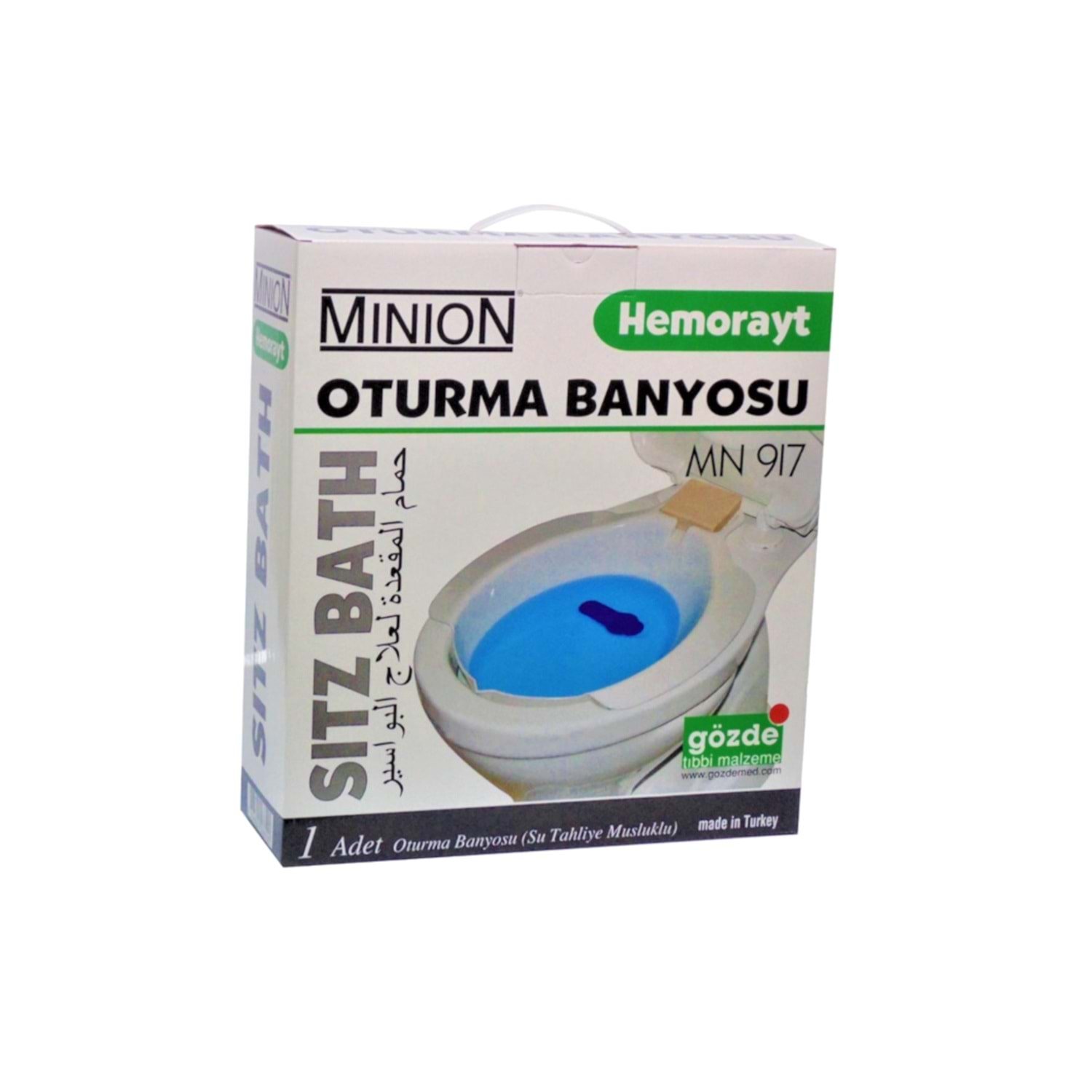 Hemoroid, basur gibi rahatsızlıklarda hastanın makat bölgesinde ağrı, yanma gibi şikayetler oluşur. Ayrıca bu bölgenin temiz tutulması vücudumuzun diğer kısımlarına göre daha zordur. Minion MN 917 bu şikayetlerin azaltılması amacıyla tasarlanmış bir hemoroid küvetidir. Küvet içine koyulan ılık su ve rahatlatıcı ilaçlar makat bölgesini hem rahatlatır hem de temizlenmesini sağlar. Minion MN 917 hemoroid küvetinin klozet dışında sandalye ve benzeri yerlerde kullanılabilmesi için 4 adet ayağı mevcuttur. Kullanım sonrası küvetin içinde kalan suyun boşaltılmasını sağlayan tahliye musluğu vardır. Menşei ülke Türkiye’dir.